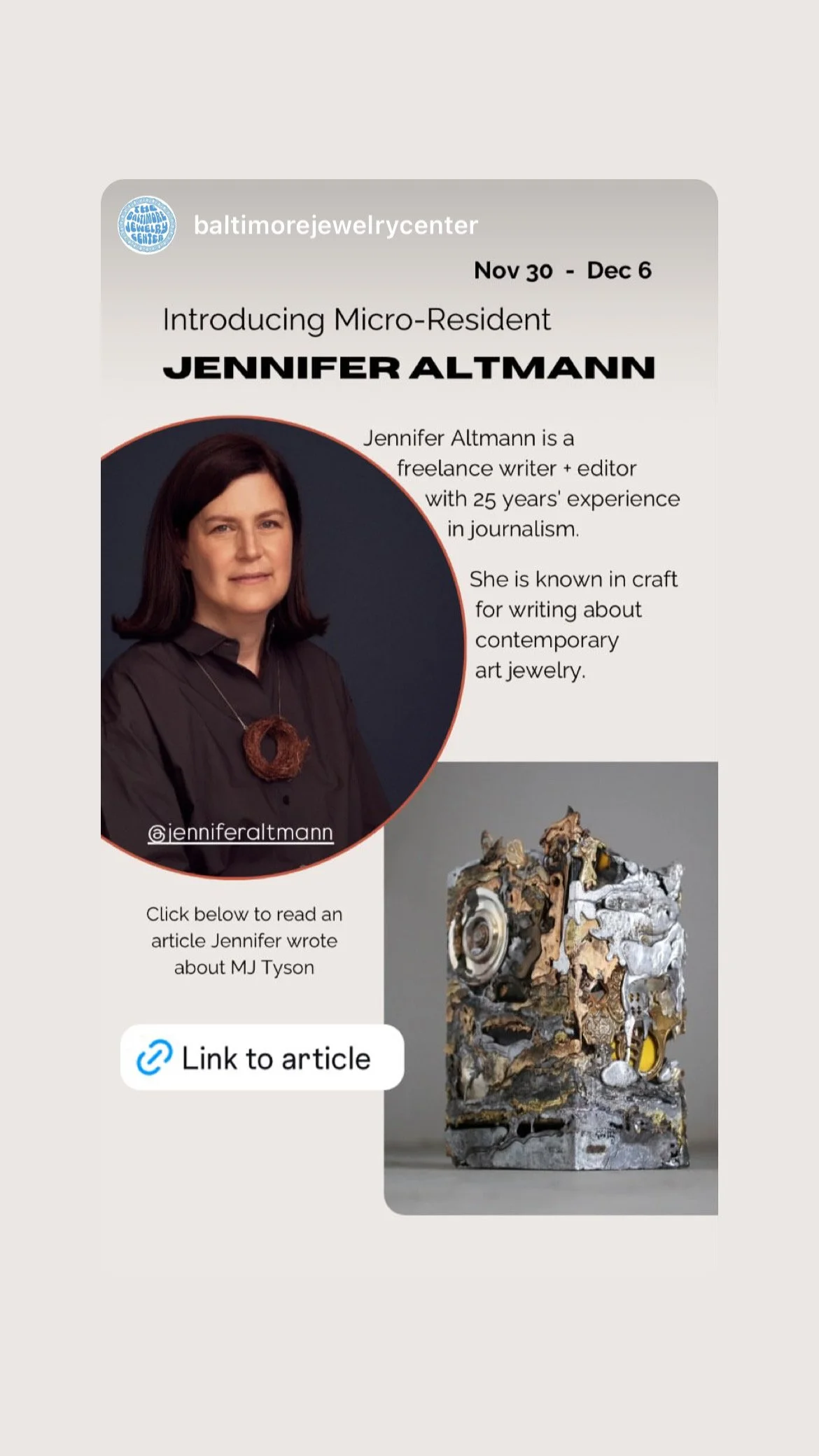 Awarded a residency at the Baltimore Jewelry Center